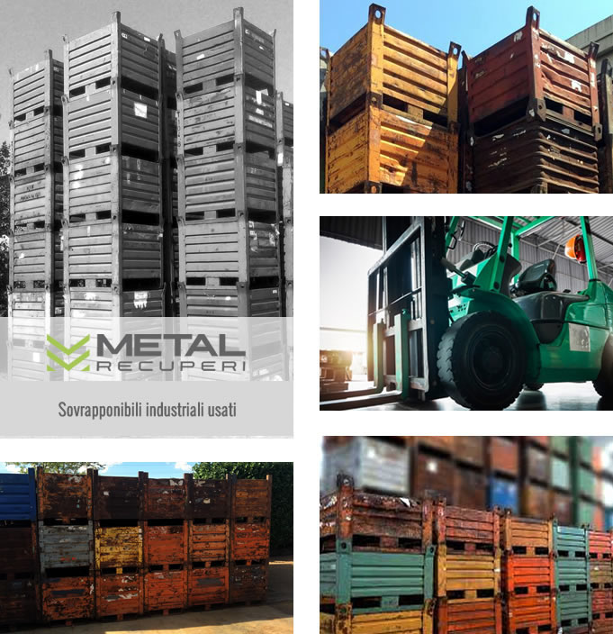 I nostri sovrapponibili in lamiera sono ideali per gestire nel modo razionale la movimentazione e lo stoccaggio di grandi volumi di merci. Le caratteristiche e le prestazioni dei sovrapponibili in lamiera possono essere diverse come i cestelli dotati di ganci o fori che ne permettono il sollevamento mediante funi o catene o cestelli forcolabili e sovrapponibili. I sovrapponibili in ferro hanno inoltre capacità di carico variabile, si può infatti passare da piccoli sovrapponibili a sovrapponibili di grosso volume. I sovrapponibili industriali usati possono essere completamente chiusi, a tenuta stagna, con sportelli in lamiera o in rete e possono essere provvisti di uno o più sportelli apribili. Lo sportello può essere posizionato anche su entrambi i lati. I sovrapponibili industriali di grosse dimensioni, hanno una struttura tubolare, che ne permette una maggiore resistenza. Da noi, alla Metal Recuperi Srl, puoi trovare tutto ciò che ti serve. Ricordati che la nostra azienda non vende solo sovrapponibili industriali usati ma acquista e vende cassoni metallici, contenitori industriali, ceste in metallo e in rete usati, in tutta Italia.